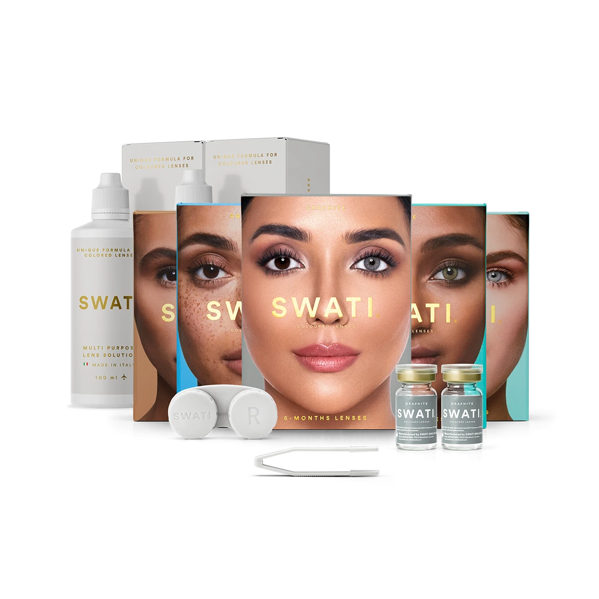 Our Royal Bundle contains our full range of 9 soft colour contact lenses that are scientifically designed for quality and ease. This bundle also includes our Multi-purpose lens solution with a unique formula for coloured lenses.