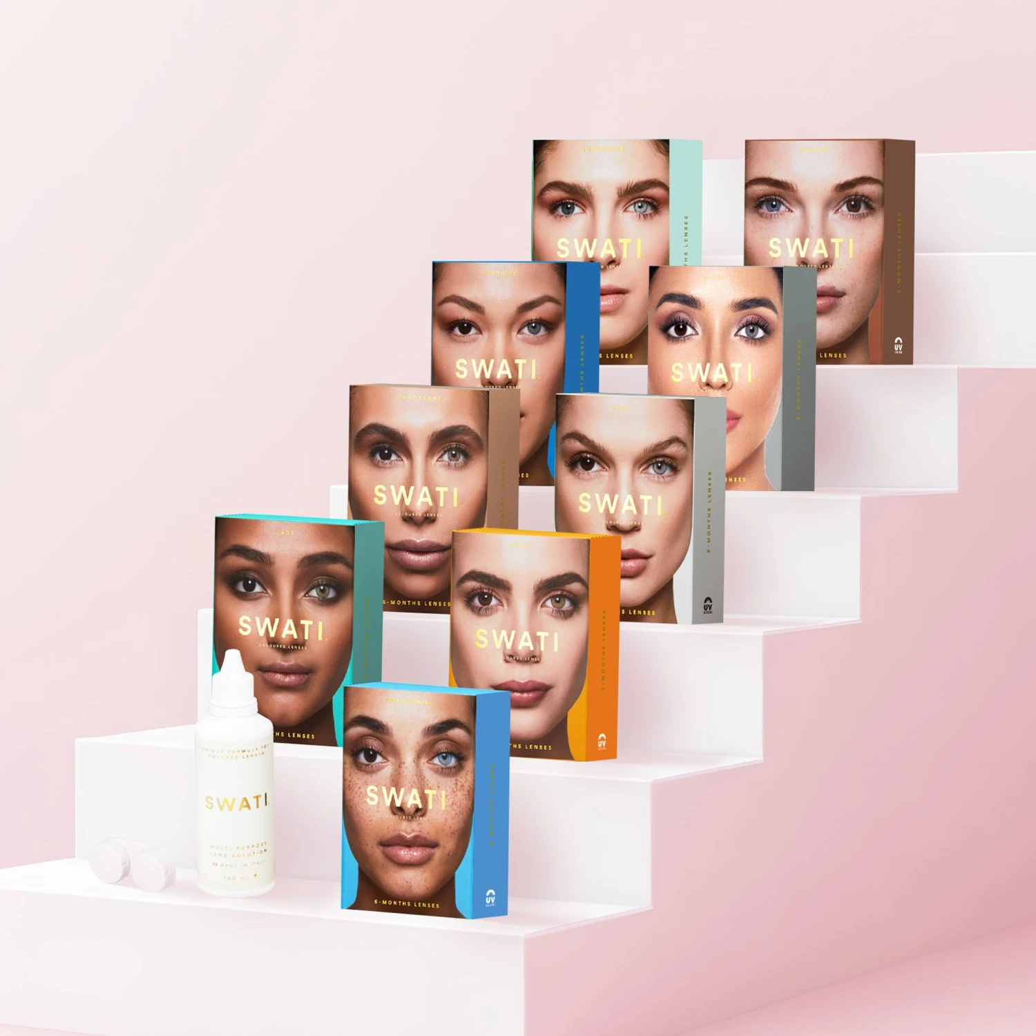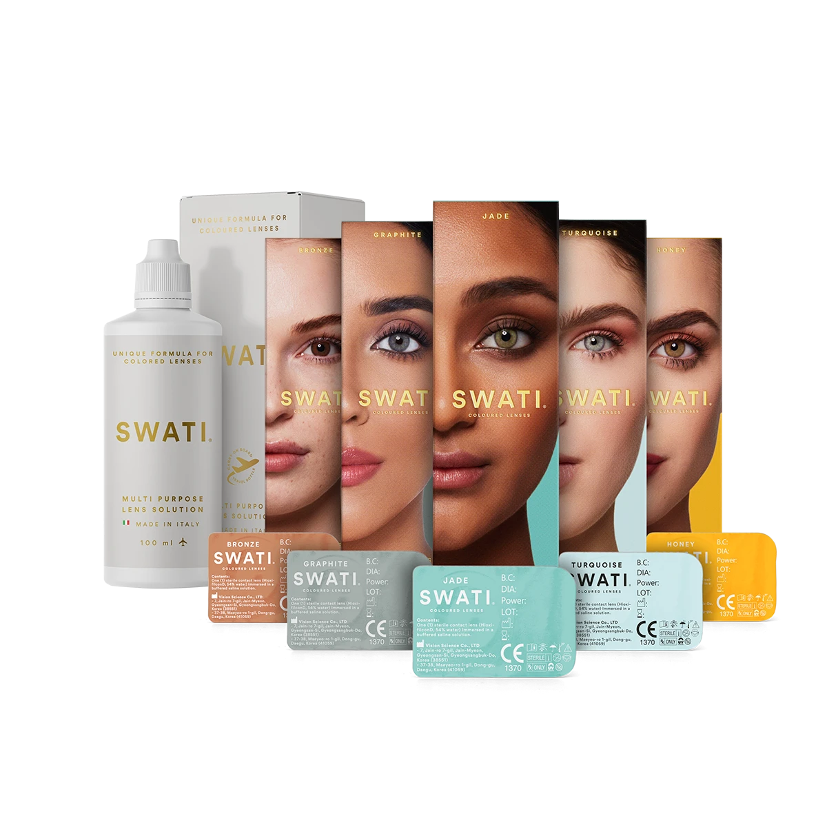 Our Royal Bundle contains our full range of 9 soft colour contact lenses that are scientifically designed for quality and ease. This bundle also includes our Multi-purpose lens solution with a unique formula for coloured lenses.